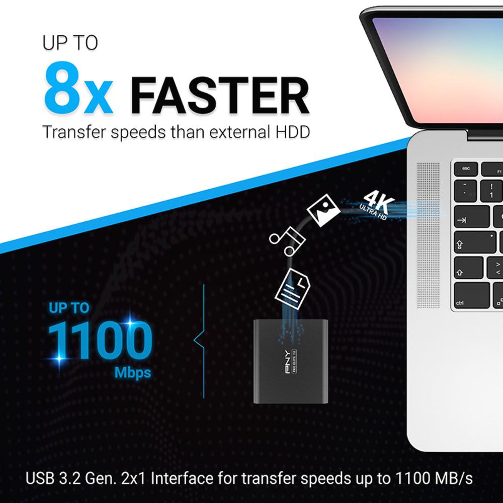 Con velocidades de lectura y escritura de hasta 1,100 MB/s y 1,000 MB/s respectivamente, este SSD portátil ofrece velocidades de transferencia hasta 30 veces más rápidas que una memoria USB 3.0.